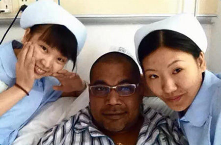 廣州現(xiàn)代醫(yī)院腫瘤病區(qū)的患者多為海外患者,溝通不便,生活習(xí)慣不適,長期的住院對他們是個(gè)很大的挑戰(zhàn)。為了讓海外患者能盡快適應(yīng)醫(yī)院的治療生活,鄢璟自學(xué)一些常用的外語,在日常護(hù)理工作中會經(jīng)常抽空到病房與患者“拉家常”,有時(shí)候還用手勢比劃聊天。譚玉秋則是患者眼中的開心果,會給患者講笑話,寬慰患者的心情。