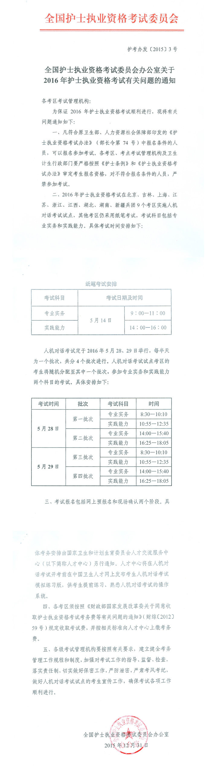 2016年護士執(zhí)業(yè)職格證考試有關問題的通知