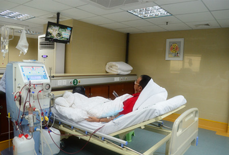 【廣州現(xiàn)代醫(yī)院每個血透單元環(huán)境舒適,設(shè)施齊全,患者可一邊看電視一邊做血透】