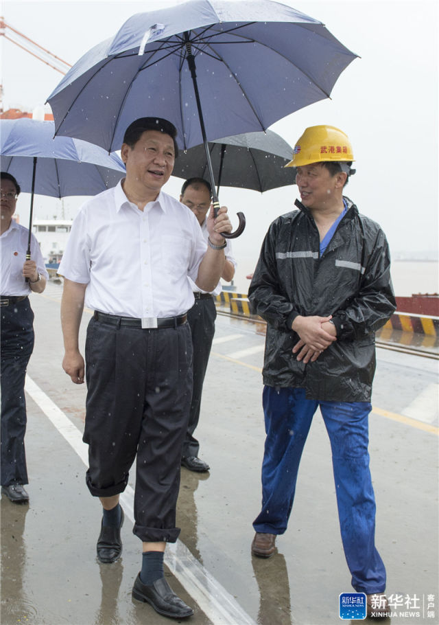 ▲2013年7月21日上午,習(xí)近平冒雨來到武漢新港陽邏集裝箱港區(qū)考察。新華社記者 李學(xué)仁 攝