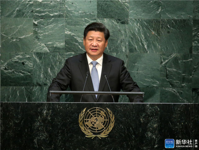 ▲2015年9月28日,習(xí)近平在紐約聯(lián)合國總部出席第70屆聯(lián)合國大會(huì)一般性辯論并發(fā)表題為《攜手構(gòu)建合作共贏新伙伴 同心打造人類命運(yùn)共同體》的重要講話。新華社記者 龐興雷 攝