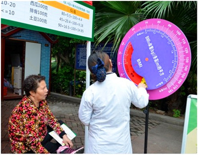 在BMI指數(shù)檢測區(qū),一位義診護士正在跟市民講解BMI指數(shù)的測量方法。