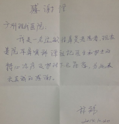 有一天,她無(wú)意間聽(tīng)說(shuō)鄰居多年的鼻炎治好了,一打聽(tīng)才知道原來(lái)是廣州現(xiàn)代醫(yī)院五官科譚主任治愈的,后來(lái)林女士抱著試一試的心理來(lái)到廣州現(xiàn)代醫(yī)院。譚主任通過(guò)仔細(xì)檢查發(fā)現(xiàn)林女士患的是比較難治愈的過(guò)敏性鼻炎。通過(guò)詢問(wèn)和分析,譚主任為林女士制定了詳細(xì)的治療方案,在譚主任的精心治療下,幾個(gè)療程結(jié)束后,20多年的鼻炎終于痊愈了!林女士不知道怎樣感激譚主任,后他決定贈(zèng)送錦旗以表達(dá)對(duì)譚主任的感謝。同時(shí)附上一封感謝信如下: