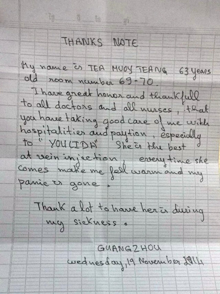信件內(nèi)容:我叫張淑珍,63歲,房號:6F 69-70(柬埔寨患者),請?jiān)试S我向全體醫(yī)護(hù)人員致以崇高的感謝。感謝大家對我精心、耐心的照顧,特別要感謝護(hù)士李琴(YOUCIDA) 以及她精湛的靜注技術(shù)。每一次她來我病房的時(shí)候,我都會內(nèi)心覺得溫暖,一點(diǎn)也不害怕。非常感謝在我生病的時(shí)候有她在身邊。