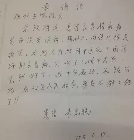 這一封是來(lái)自患者朱寬聰?shù)谋頁(yè)P(yáng)信,患者因長(zhǎng)期胃腸疼痛沒(méi)有治愈經(jīng)過(guò)朋友介紹來(lái)到我院找光興國(guó)醫(yī)師看病,只吃了兩副中成藥就好了,而且錢(qián)也不貴真心的為人民服務(wù)。