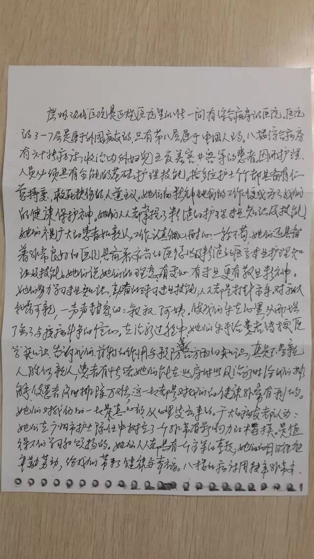 上面這封特殊的感謝信,是多位廣州市70-80歲的老年患者們共同的心聲。信中懇切的言語(yǔ)、源于內(nèi)心真情的流露,不是幾句話(huà)語(yǔ)及表?yè)P(yáng)能夠道來(lái)的。信概括了每位護(hù)理人員的特長(zhǎng)及優(yōu)點(diǎn),表?yè)P(yáng)綜合病區(qū)全體護(hù)理姐妹們“專(zhuān)心、專(zhuān)業(yè)、敬業(yè)的精神,你們的仁慈博愛(ài)、救死扶傷的仁道主義精神成為了我們的保護(hù)神”。