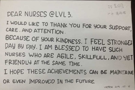 非常感謝三病區(qū)醫(yī)護人員對我的的支持,關(guān)心和照顧,因為你們的善良,讓我病情一天天的好轉(zhuǎn)起來。你們象天使般的照護是上天對我的眷顧,你們不僅技術(shù)嫻熟而且待人也很友好,希望這些成就能保持下去,祝愿將來能更上一層樓。