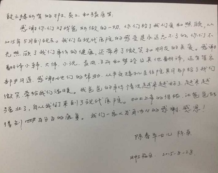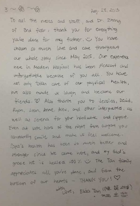 昨日(中新合資)廣州現(xiàn)代醫(yī)院管家部,收到來自腫瘤三病區(qū)患者陳春花女兒陳英寫來的感謝信,感謝三樓所有護(hù)士、員工和張醫(yī)生,從5月至今住院期間不僅收獲了健康同時(shí)也收獲了朋友的關(guān)愛與幫助。特別感謝韓敬榮、陳大偉、莫長風(fēng)、王利、李夢(mèng)琳等翻譯和管家部尹月蓮。信的內(nèi)容如下: