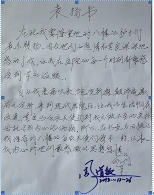 昨日,(中新合資)廣州現(xiàn)代醫(yī)院收到患者周道敏的對綜合病區(qū)護士的表揚信,在住院期間護士們對自己悉心照顧讓周道敏倍感溫暖,特此寫了一封感謝信,信的內(nèi)容如下: