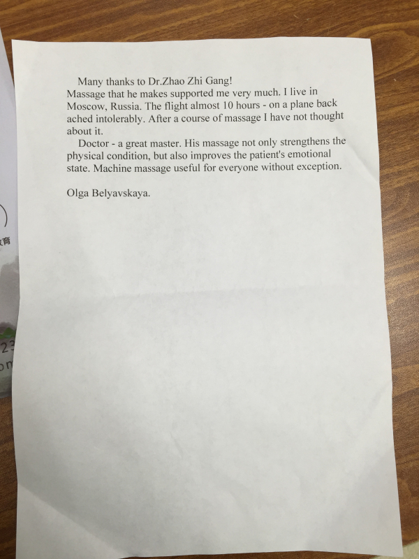 【廣州現(xiàn)代腫瘤醫(yī)院病區(qū)快訊】來自三病區(qū)的俄羅斯患者卡婭(直腸癌肝轉移,經(jīng)過肝臟射頻消融術,介入等綜合治療,腫瘤細胞大量壞死。),于今天上午給中醫(yī)師趙志剛寫了一封感謝信,肯定了趙醫(yī)生的中醫(yī)推拿按摩療法,不僅改善了患者的身體狀況,還提高了患者的精神狀態(tài)與生活質量。以下為感謝信的原文及譯文: