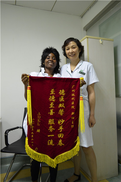 9月25日,在(中新合資)廣州現(xiàn)代醫(yī)院婦科主任鄭頌的辦公室,一位黑皮膚的年輕女子將一封感謝信和一面寫著“德醫(yī)雙馨,妙手回春”的錦旗送給了鄭頌主任!