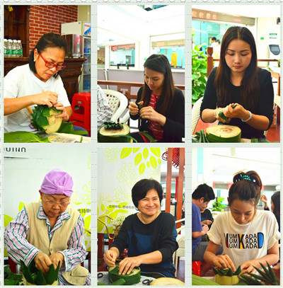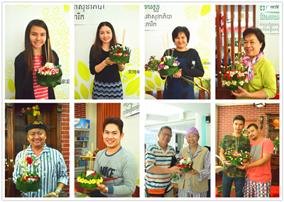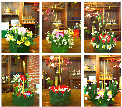 以裁切好的芭蕉樹(shù)干為底座,將裁剪好的芭蕉樹(shù)葉折成各種尖角,用牙簽固定好,再配以各種顏色的小雛菊、康乃馨、玫瑰、滿(mǎn)天星等鮮花、后一個(gè)花香四溢、小巧精致的水燈就大功告成了!盡管都是來(lái)自泰國(guó),但他們制作的水燈卻風(fēng)格不一,各有特色,別致的造型充分體現(xiàn)了泰國(guó)人的心靈手巧。5樓的泰國(guó)患者麗達(dá)婉的女兒告訴筆者:“以前水燈節(jié)的時(shí)候,家里的河燈多數(shù)都是在外面買(mǎi)回來(lái)的,很少自己做,所以這次自己做河燈,真的覺(jué)得很好玩也開(kāi)心。”