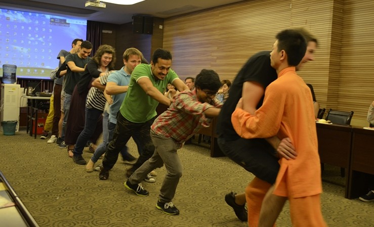 “靜而能定,定則屹立不倒”是太極功夫的一大特色。圖為廣州現(xiàn)代醫(yī)院患者及家屬與廣東第二師范學(xué)院留學(xué)生們組成9人線陣,試圖推倒太極師傅。