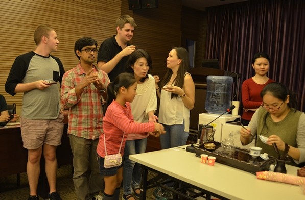 聞茶道、品茶香,在中華文化共享會上,大家圍到了茶藝師身邊,學(xué)習(xí)不同茶種泡制方法,品茗中國茶香。