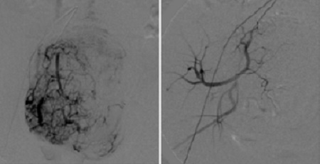 在DSA減影系統(tǒng)下可見,子宮肌瘤在經(jīng)過栓塞術(shù)后從10cm縮小到1cm