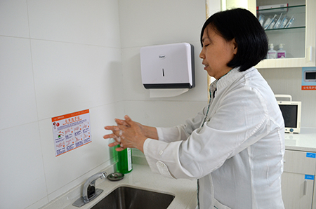 經(jīng)過3月份的手衛(wèi)生操作培訓(xùn)以及日常工作中對手衛(wèi)生操作的規(guī)范化要求,廣州現(xiàn)代醫(yī)院的員工包括臨床人員以及后勤人員均對手衛(wèi)生操作有較為深入的了解。“內(nèi)、外、夾、弓、大、立、腕”七個字是手衛(wèi)生操作的七個基本步驟,而且這個基本步驟在醫(yī)院每一個洗手臺都有張貼,時刻提醒員工注意按照國際醫(yī)療標(biāo)準(zhǔn)將手衛(wèi)生操作落實到位。另外,手衛(wèi)生的五個時刻:1、接觸病人前;2、清潔/無菌操作前;3、接觸病人血液體液后;4、接觸病人后;5、接觸病人環(huán)境物品后。每一位員工都謹(jǐn)記于心。