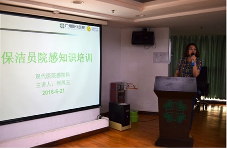 6月21日,廣州現(xiàn)代醫(yī)院組織2016年度全院保潔員院感知識培訓,醫(yī)院感控科何鳳玉主任擔任主講師,全院負責保潔工作的員工參加培訓。