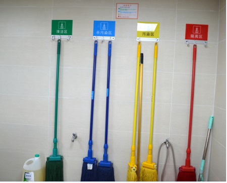 針對保潔工具的擺放,何鳳玉主任要求:保潔人員必須清楚相關區(qū)域的劃分,人員應相對固定、明白各區(qū)域清潔、消毒用具的使用方法;保潔工具需定點按標識放置,清潔、污染的不能混用。