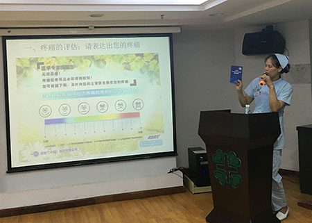 隨后,腫瘤七病區(qū)王軍蘭護(hù)士長做了《癌痛規(guī)范化治療與護(hù)理》常規(guī)知識(shí)培訓(xùn)。王軍蘭護(hù)士長從以下4個(gè)方面進(jìn)行講解:疼痛的評估;癌痛的治療;疼痛的繪制與記錄;癌痛的護(hù)理等。