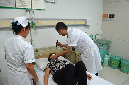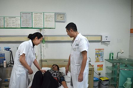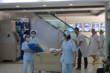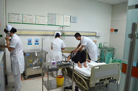 護(hù)士給患者輸液并測(cè)血壓,葉登主任檢查后發(fā)現(xiàn)患者情況比較危急,馬上叫護(hù)士打電話通知搶救組組長(zhǎng)楊欣主任到場(chǎng)搶救,并啟動(dòng)應(yīng)急搶救系統(tǒng)。