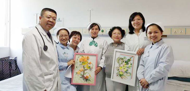 這四幅手工掛畫(huà)分別包含了獨(dú)特的意義。吳氏秋香的姐姐介紹道:“彭主任的性格十分溫和,我就在送他的掛畫(huà)上制作了兩只白天鵝,也借此祝福他和他太太的感情幸福美滿。” 同時(shí),“馬主任長(zhǎng)得漂亮,掛畫(huà)上我便用了玫瑰花來(lái)作點(diǎn)綴,右上角還有一個(gè)吉他,希望她的工作和生活都像音樂(lè)一般美好。”而對(duì)于主治醫(yī)生王增海和翻譯蘇永朝,她們也分別在掛畫(huà)上使用了借喻的表現(xiàn)手法,以此祝福他們生活愉快,家庭幸福。