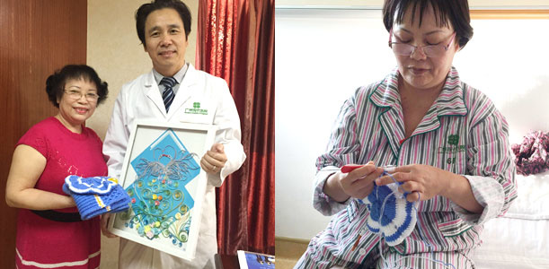 圖為吳氏秋香的姐姐親手為彭主任送上手工掛畫(huà),還有給彭主任小孩的帽子與衣服。彭主任接過(guò)禮物感動(dòng)地說(shuō)道:“等我小孩穿上這帽子跟衣服,我一定拍張照片給你看。真的十分感動(dòng),感謝患者及家屬對(duì)圣丹福廣州現(xiàn)代腫瘤醫(yī)院的贊賞與肯定。”