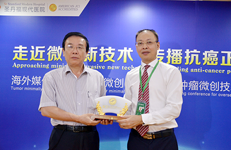 廣州現代醫(yī)院院長王懷忠與海外記者贈送禮物